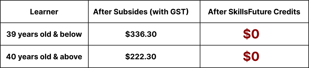 您将享受 SkillsFuture Singapore (SSG) 50%的学费补贴,因此您只需支付336.30新元